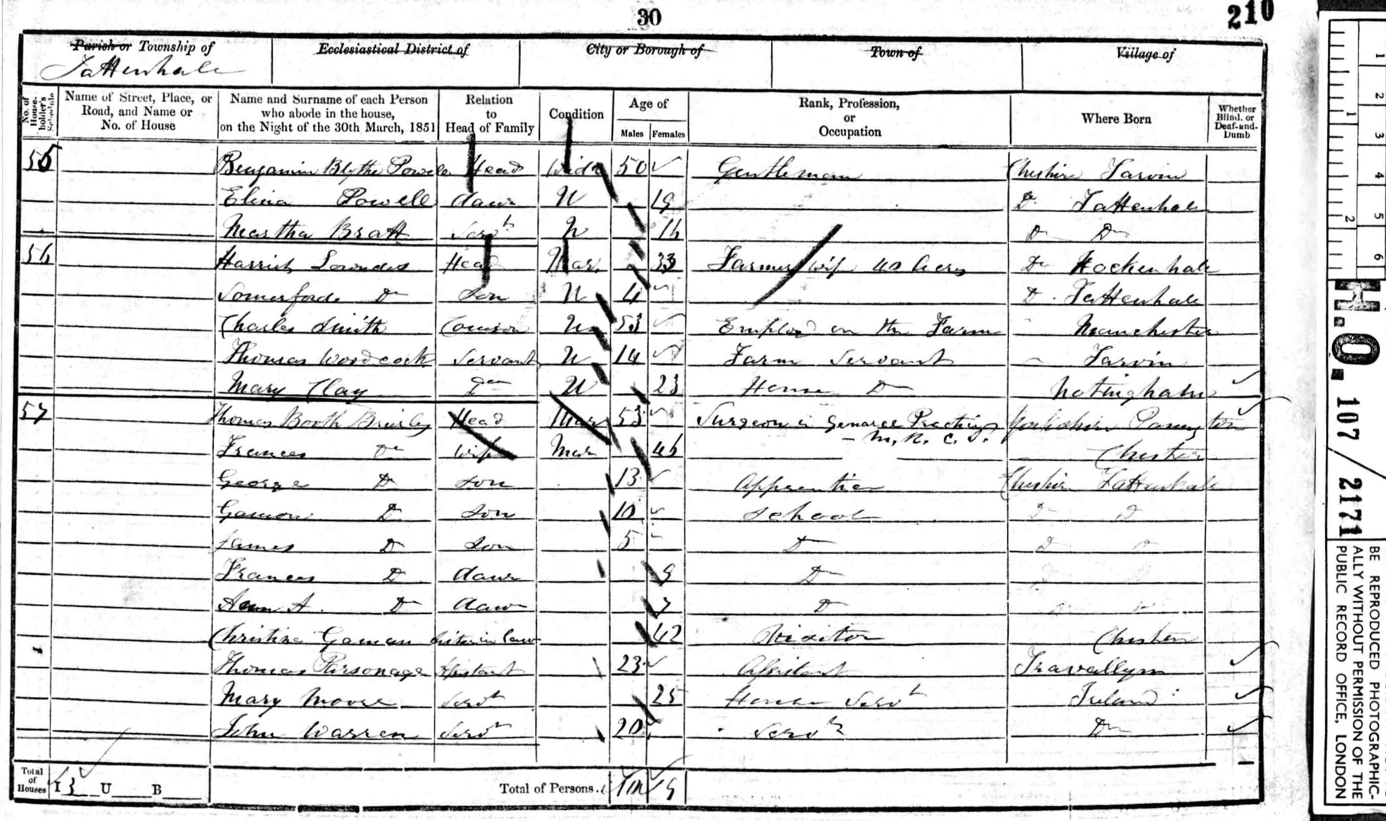 | Marriage* | Thomas Parsonage married Frances Elizabeth Blake, daughter of Thomas Blake and (?) (?), on 17 November 1853 at Malpas Parish Church, Malpas, Cheshire, and the ceremony was witnessed by Timothy Parsonage and Catherine Parsonage; On his marriage certificate Thomas gave his occupation as surgeon. This was probably an embellishment of the truth, as he had been an assistant to a surgeon just two years earlier on the census. |