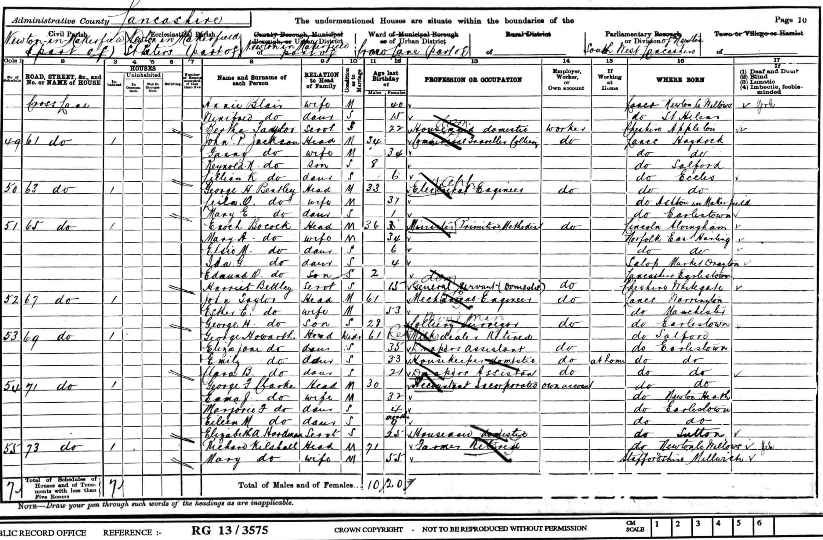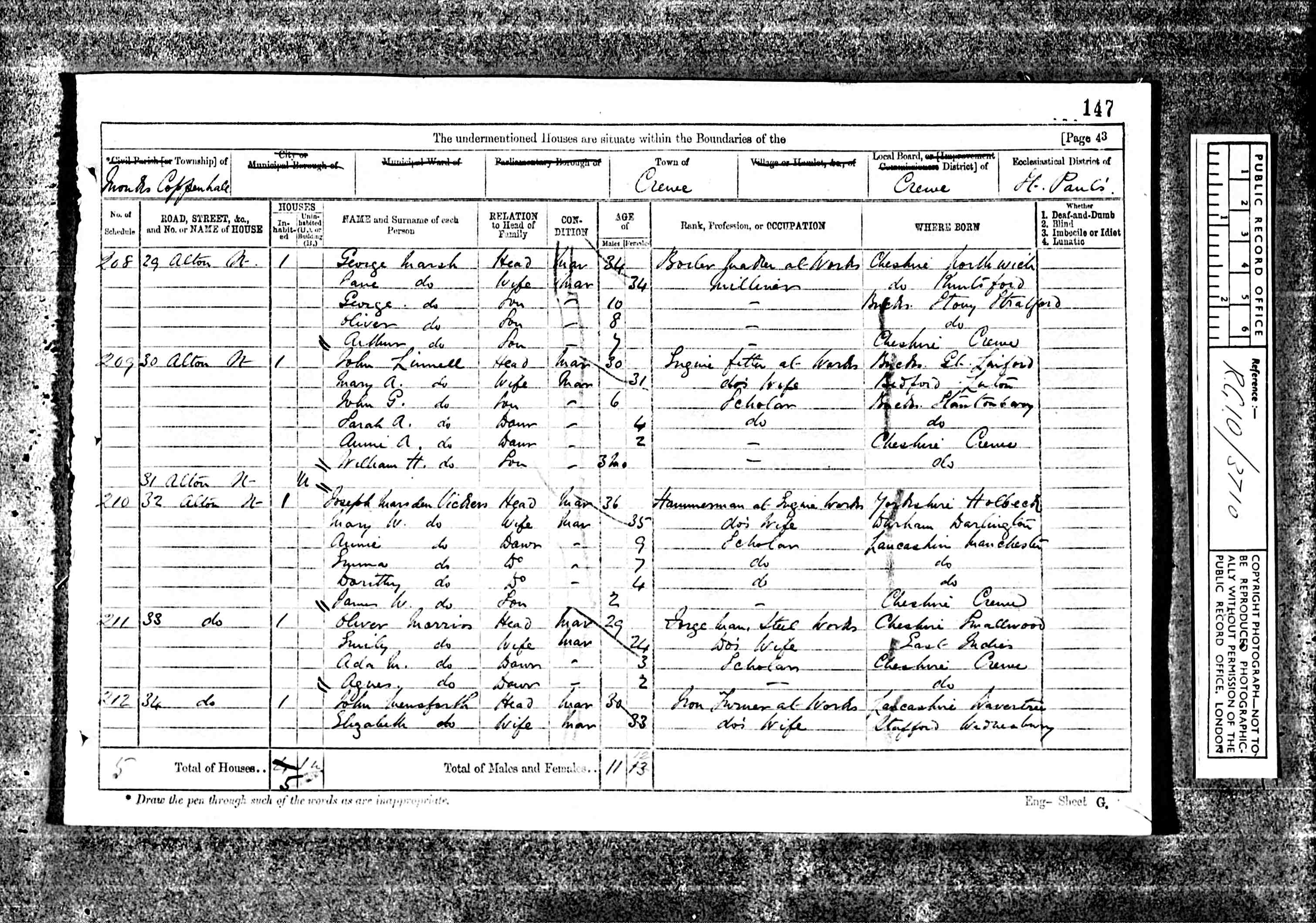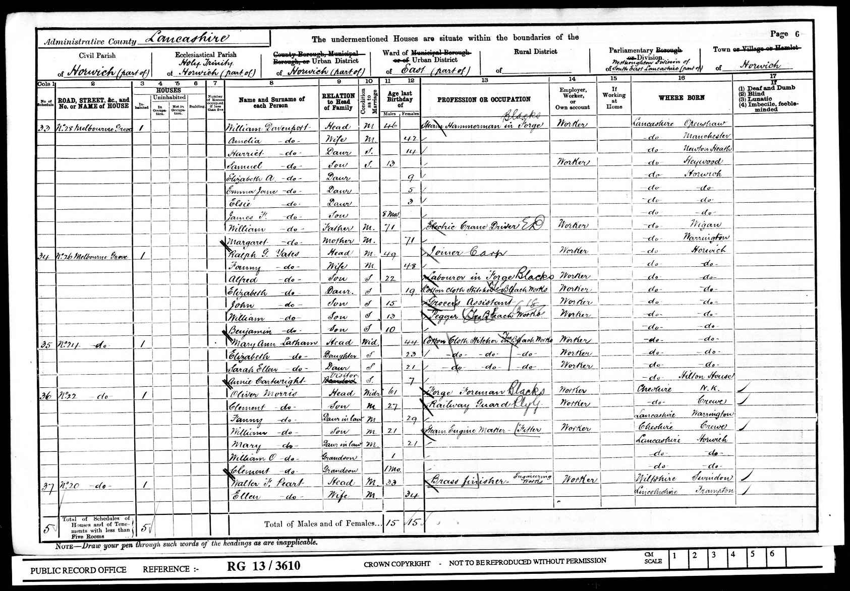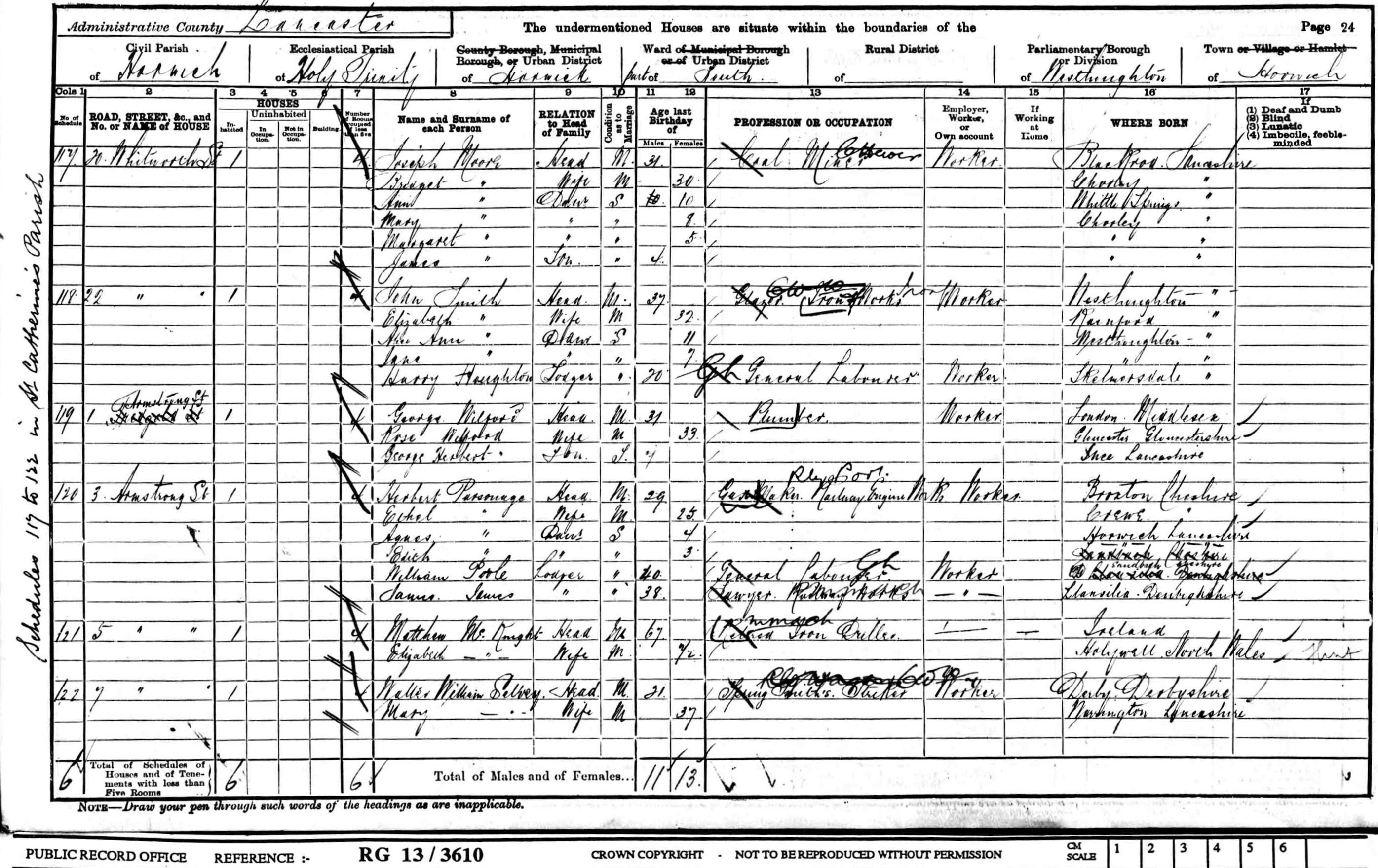 Oliver Morris was born circa 1840 at Smallwood, Cheshire. He appeared on the 1841 Census in Smallwood, Cheshire, and Samuel Morris, Sarah Broad and Ellen Morris were living in the same household; The head of the household, Samuel described himself as a farmer. Oliver Morris appeared on the 1851 Census in Spark Lane, Brereton cum Smethwick, Cheshire, and Samuel Morris, Sarah Broad, Ellen Morris, Thomas Morris, Charles Morris, William Morris, Fanny Morris and Sarah Morris were living in the same household; Samuel was a farmer of 25 acres. Oliver Morris appeared on the 1861 Census in, Cheshire, ; Oliver was a lodger and agricultural labourer. Oliver Morris married Emily White, daughter of William White and Esther (?), on 27 December 1866 at St Mary's, Nantwich, Cheshire, and the ceremony was witnessed by Charles Morris and Martha Platt; At the time of the marriage Oliver was a mechanic living in Coppenhall, and Emily was living in Nantwich. Oliver Morris appeared on the 1871 Census in, Crewe, Cheshire, , and Ada Mary Morris, Agnes Morris and Emily White were living in the same household; Oliver, the head, was described as foregman steel works, also present was wife Emily and daughters Ada and Agnes. At the time of his daughter Emily's birth in 1875 the family lived at 56 Alton Street, Monks Coppenhall and Oliver was a Forgeman. Oliver Morris appeared on the 1881 Census in 26 Alton Street, Monks Coppenhall, Crewe, Cheshire, and Emily White, Ada Mary Morris, Agnes Morris, Arthur Morris, Oliver Morris, Clement Morris, Esther Ann Morris and William Henry Morris were living in the same household; The head of household, Oliver was described as a forgeman (iron), and Emily was described as a British Subject born East Indies. Early in 1885 the Lancashire and Yorkshire Railway Company started the building of the Horwich Locomotive Works. There were several large buildings on the site , the largest being the erecting shops which was 1520 feet in length. Six and a half miles of narrow guage railway serviced the site and some of the large workshops were lit by electricity, something of an innovation at the time.
