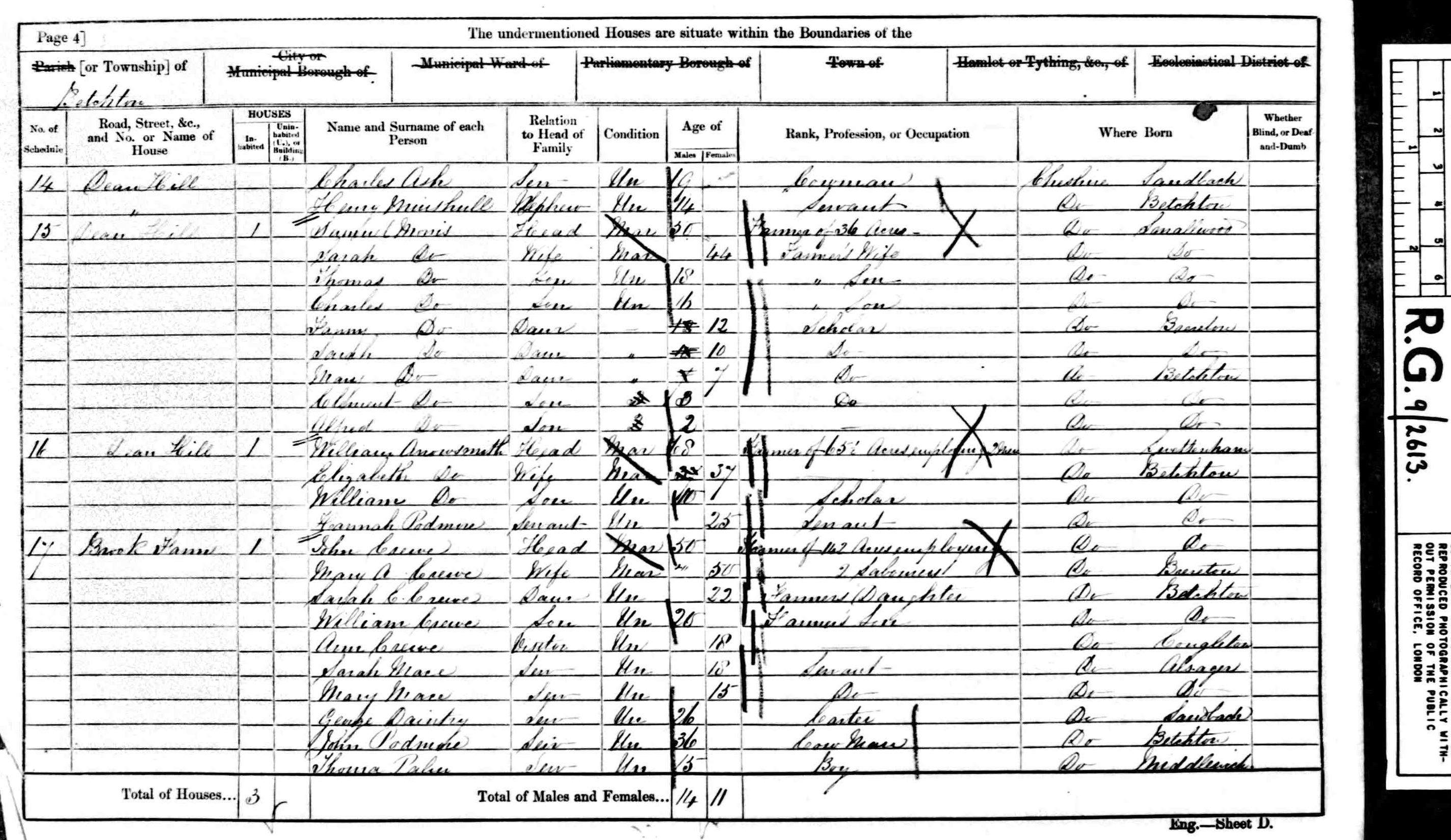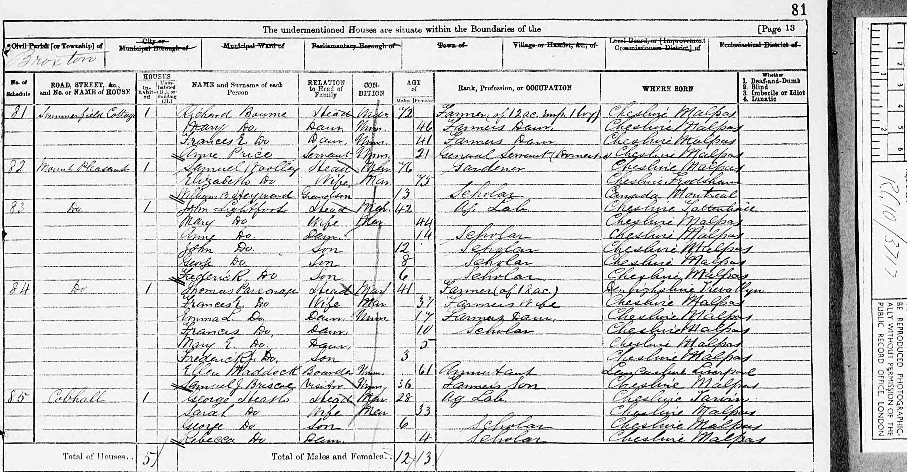 Samuel Morris was born circa 1811 at Astbury, Cheshire. He married Sarah Broad, daughter of John Broad and Sarah Hockenhull, on 5 September 1838 at Parish Church, Astbury, Cheshire. Samuel Morris appeared on the 1841 Census in Smallwood, Cheshire, and Sarah Broad, Ellen Morris and Oliver Morris were living in the same household; The head of the household, Samuel described himself as a farmer. Samuel Morris appeared on the 1851 Census in Spark Lane, Brereton cum Smethwick, Cheshire, and Sarah Broad, Ellen Morris, Oliver Morris, Thomas Morris, Charles Morris, William Morris, Fanny Morris and Sarah Morris were living in the same household; Samuel was a farmer of 25 acres. Samuel Morris appeared on the 1861 Census in Dean Hill, Betchton, Cheshire, and Sarah Broad, Thomas Morris, Charles Morris, Fanny Morris, Sarah Morris, Mary Morris, Clement Morris and Alfred Morris were living in the same household; Samuel was a farmer of 36 acres. Samuel Morris appeared on the 1871 Census in Dunnocks Fold, Hassall, Cheshire, and Sarah Broad, Sarah Morris, Mary Morris, Clement Morris and Alfred Morris were living in the same household; Samuel was a farmer of 96 acres employing one hand. Samuel Morris appeared on the 1881 Census in Dunnocks Fold, Hassall, Cheshire, and Sarah Broad, Mary Morris, Clement Morris, Alfred Morris, Henry Morris and Samuel Morris were living in the same household; Samuel was a farmer of 90 acres employing one hand. Henry and Samuel (Jnr) were recorded as grandsons. Also living with the family was a general servant Anne Griffiths aged 16 years. Samuel Morris appeared on the 1891 Census in Dunnocks Fold, Hassall, Cheshire, and Sarah Broad and Henry Morris were living in the same household. Samuel Morris died on 26 March 1892 at Dunnocks Fold, Hassall, Cheshire.