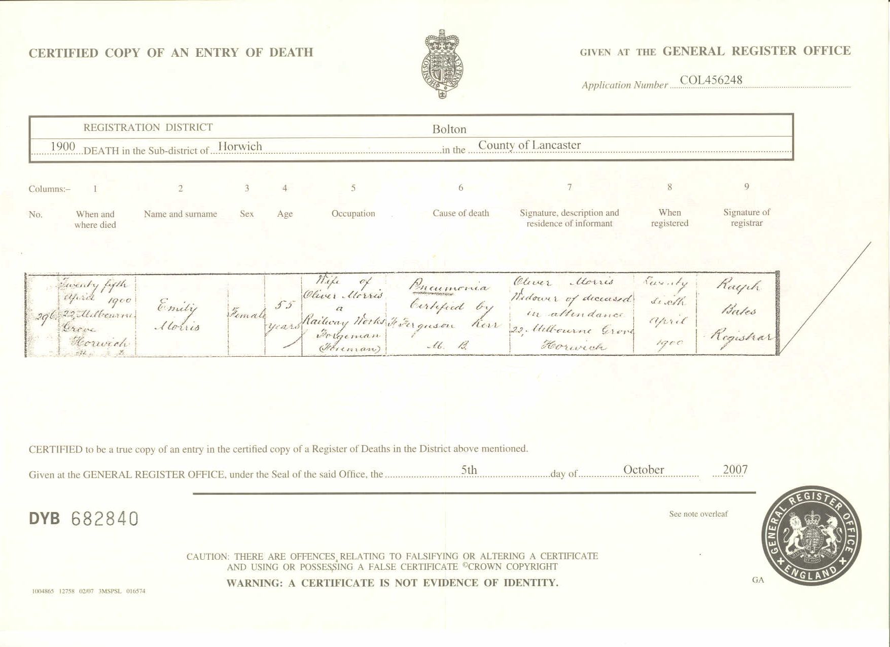 A lot of men came from the company workshops at Miles Platting and Bury. The first workmen arrived in November 1886. There were seventeen of them and during the early months of 1887 around twenty a week were taking up work in Horwich, some travelling back to Manchester at the weekends to their families. By mid February 200 employees had taken employment at the new works, and by 1894 there were 3000 men employed there. It appears Oliver was a forge foreman at the works and three of his sons were working there in 1891. He may also have been a foreman wheelwright at the works at some time. Winifred Morris (#519), his gt granddaughter wites in 2006 - "I remember that when I was still at Primary School I had piano lessons with a lady in Melbourne Grove and she insisted on presenting me to her father as the great-granddaughter of Oliver Morris whom he remembered living in the same road. According to my mother he was well known because he was such a striking figure- well over 6 ft and weighing 20 stone but I can't think she met him unless he lived to be a very old man." Oliver Morris appeared on the 1891 Census in 192 Chorley New Road, Horwich, Bolton, Lancashire, and Emily White, Arthur Morris, Oliver Morris, Clement Morris, Esther Ann Morris and William Henry Morris were living in the same household; The head of household, Oliver was described as a forge foreman. Arthur, Oliver and Clement were also described as forgemen. Also lodging in the household was another forgeman, Joseph Webb aged 16 years. He is shown in a number of local Bolton Directories as living at 192 Chorley New Road until 1898. He appears in a number of Bolton directories between 1902 and 1907 describing himself as a forge foreman and living at 22 Melbourne Grove, Horwich. Oliver Morris appeared on the 1901 Census in, Bolton, Lancashire, , and Clement Morris, Fanny (?), William Henry Morris, Mary Sale and Clement Morris were living in the same household; Oliver was described as Forge Foreman, Clement as Railway Guard and William as Steam Engine Maker - Fitter. Another grandson of Oliver was in the household - William 1 year born in Horwich but it is not clear who the parents are. A Mrs Winstanley of Horwich ( born c 1911 ) writes in a letter in 1993 that her godmother was Ada Morris ( later Rodgers ), Oliver's daughter. She says that Oliver lived with Ada, and she remembers him giving her buttered brazil nut toffee and saying ' suck it don't crunch it.' Mrs Winstanley lived at 23 Fairburn St and Ada lived at 22. Oliver Morris died in 1928.
