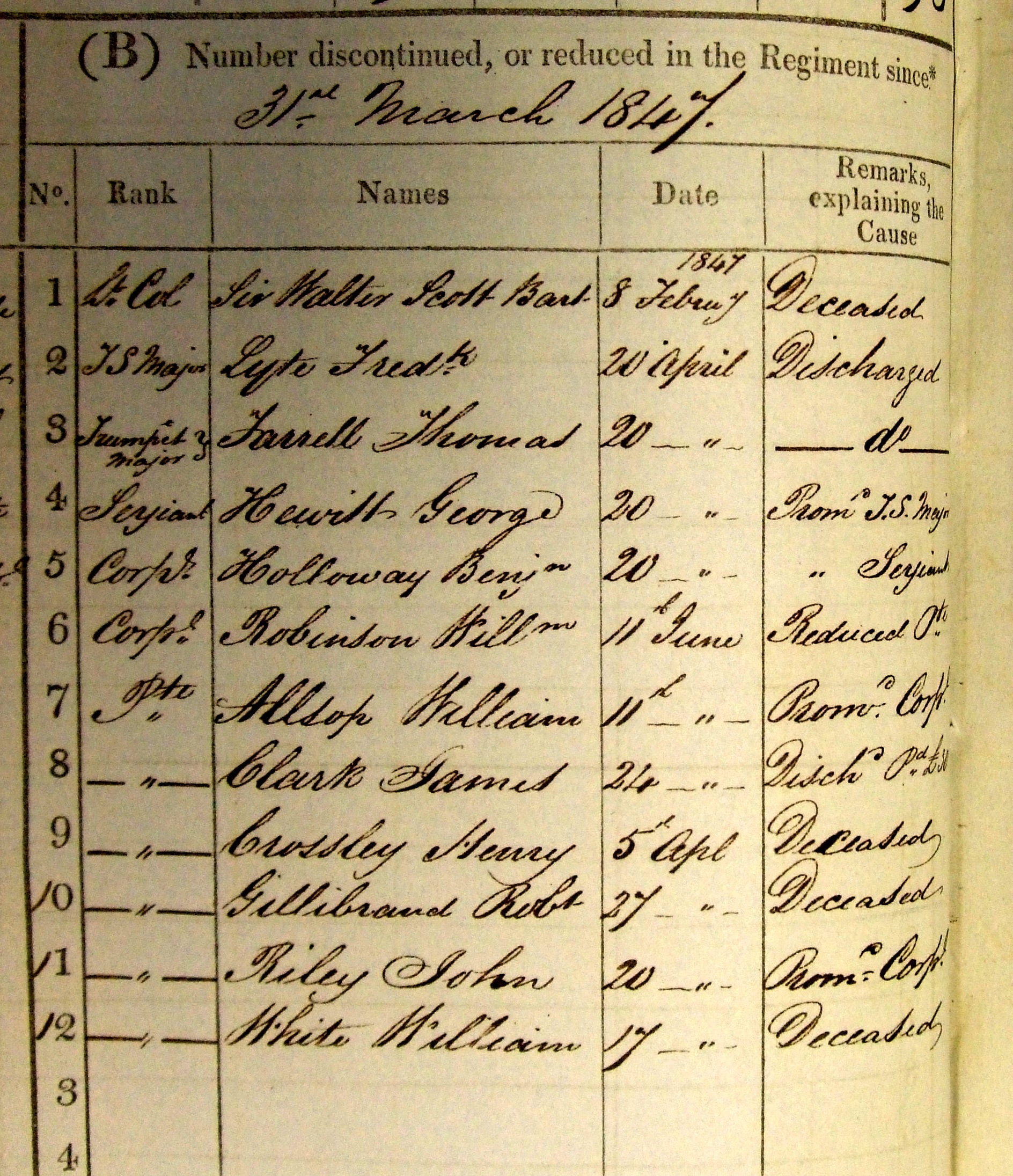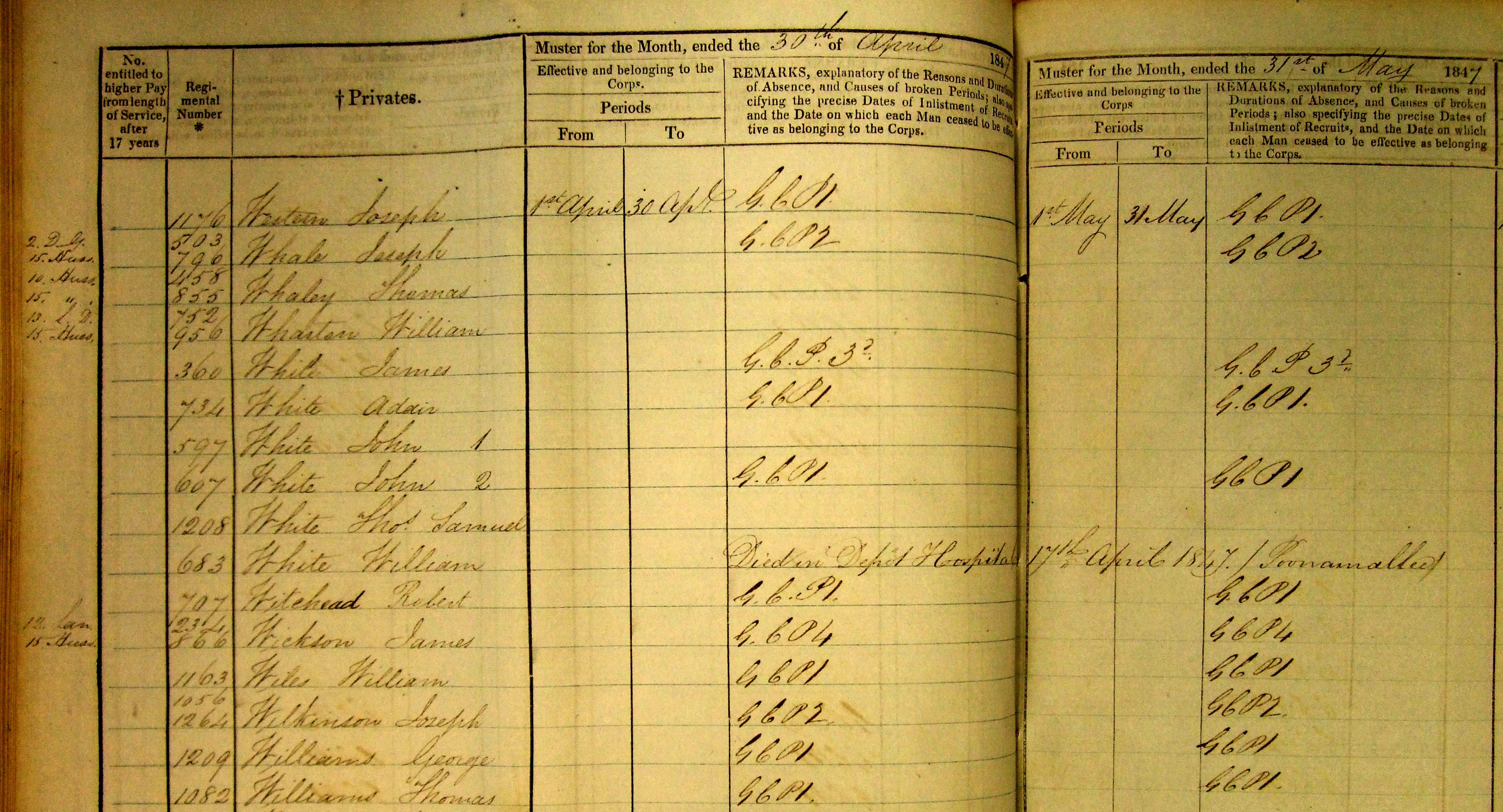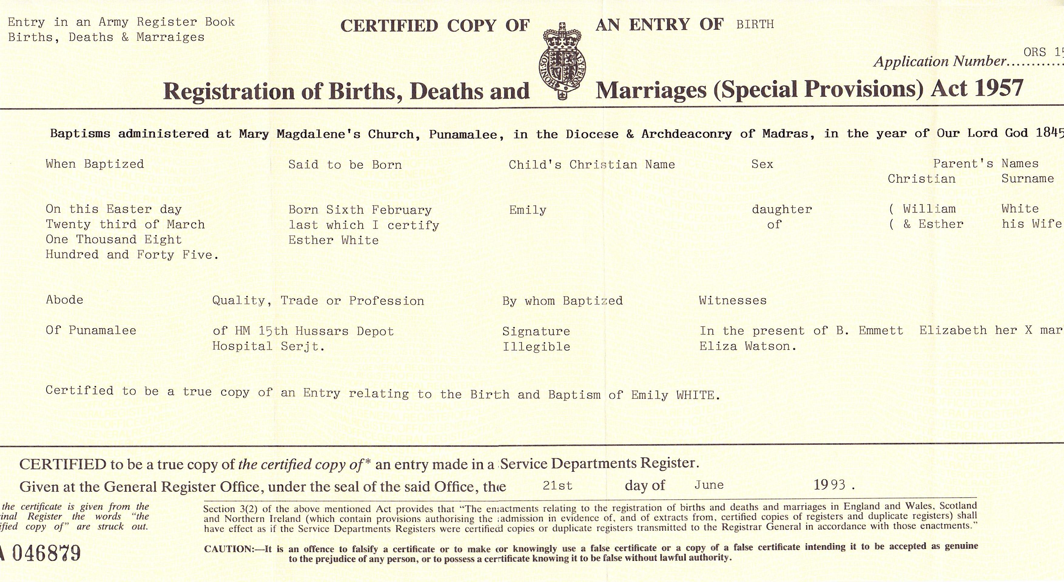 The next set of muster rolls (WO12/1212, 1839-1841) shows that within three months of enlisting Private William White was on his way to India. The April-June musters in Chatham state that he "embarked for Bombay" on 3rd June 1839 and the July-September musters show that he "landed in India" on 19th September 1839. He married Esther (?); In the April-June 1843 musters (WO12/1213) - Private White was "On Furlo' 22 April to 30th June 1843", (that's to say, he was on leave). This was presumably in India and the cryptic entry suggests that this might have been when he married Esther, though the regimental rolls are no help with this whatsoever. His leave period (and his marriage?) might also have had something to do with him being put on permanent detachment to Madras almost as soon as the leave ended, rather than staying with the regiment in Bangalore. On 23 March 1845 at, Poonamallee, Tamil Nau, , India, William White was described in the baptismal certificate of his daughter Emily as Hospital Serjt. of HM 15th Hussars Depot. He died on 17 April 1847 at, Tamil Nadu, , India, at age 31; In WO12/1219, musters for April 1847 to March 1848 the entry for the April muster read as follows : No 683 White William. Died in Depot Hospital 17th April 1847 / Poonamallee".This was confirmed on a subsequent page entitled "Number discontinued or reduced in the Regiment since 31st March 1847" (see pic 009): It read simply: