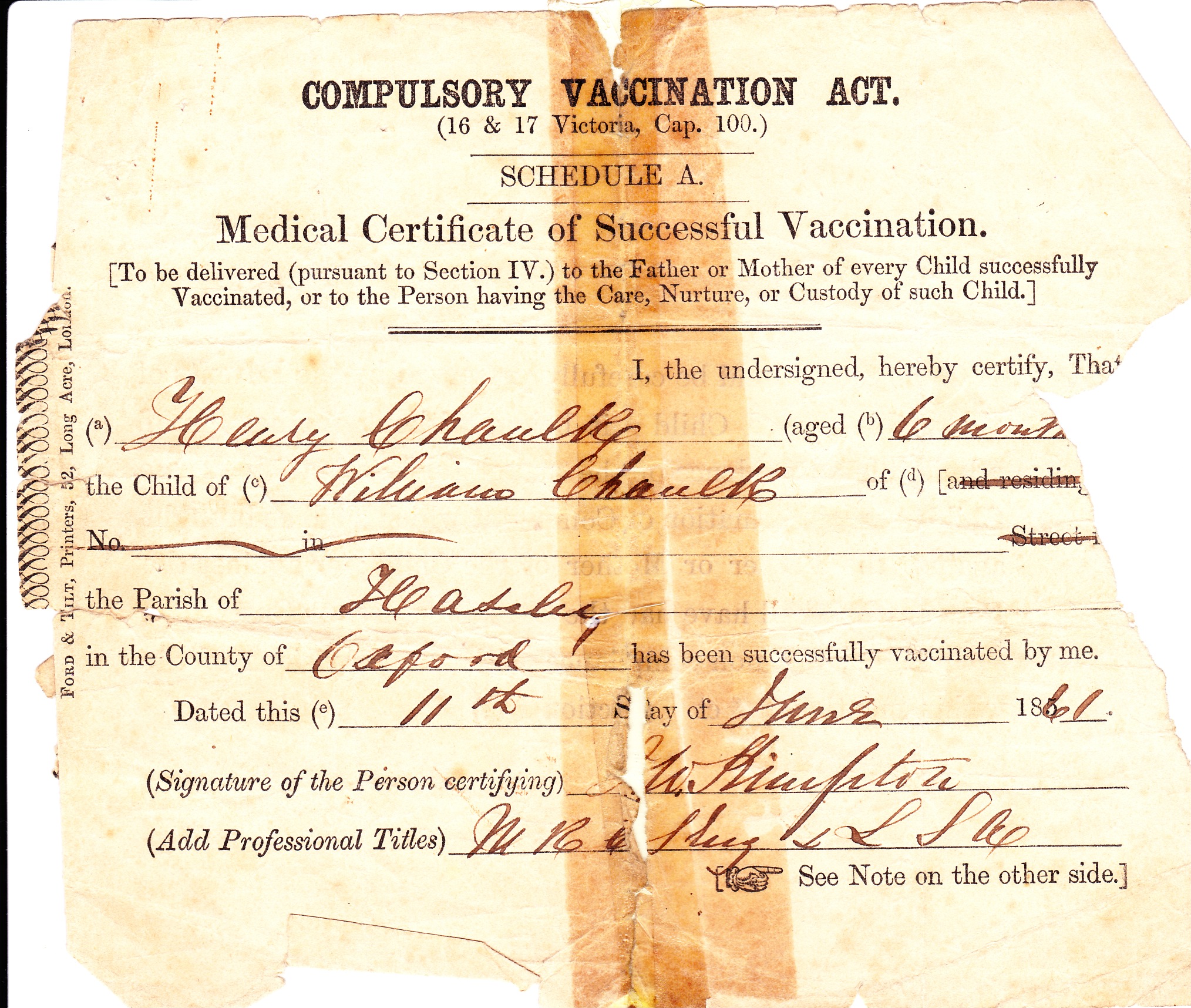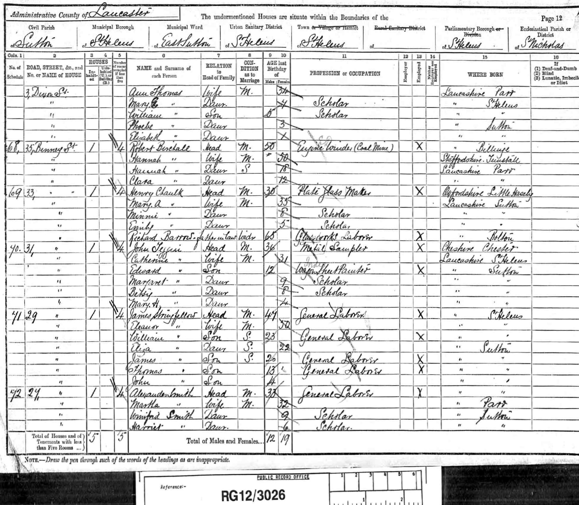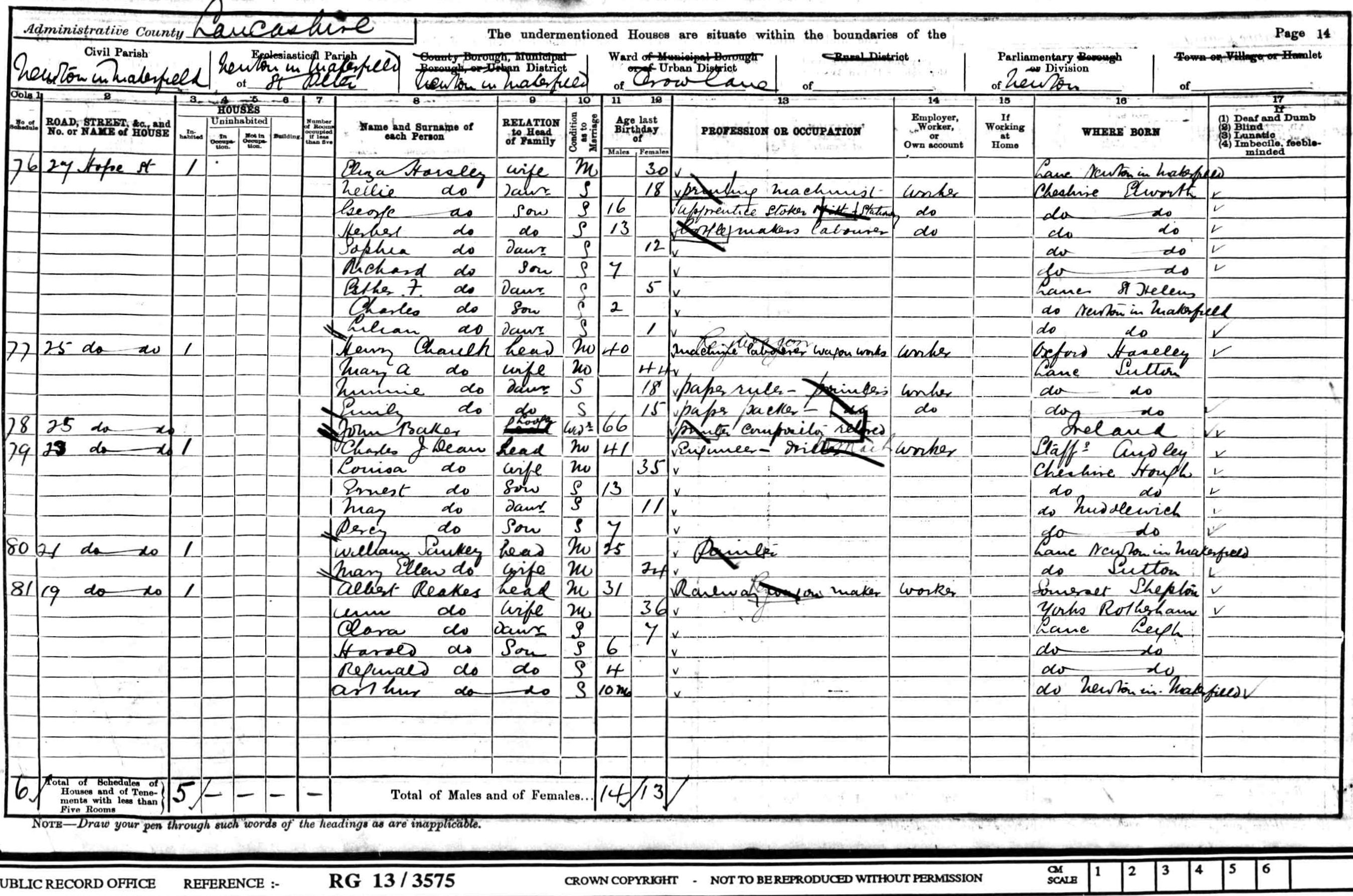 Henry Chaulk was born on 29 November 1860 at, Little Haseley, Oxfordshire, . Elsie his daughter believes Henry was a coachman in Oxfordshire before he moved North. She remembers a pair of brown corduroy breeches he used to keep in a drawer at 20 Houghton St, Earlestown. He moved to the North West at the time of the boom in the railways presumably for employment. He was christened on 20 January 1861 at St Peters Church, Great Haseley, Oxfordshire. He appeared on the 1861 Census in Great Haseley, Oxfordshire, and William Chaulk, Mary Thorn, Elizabeth (Bess) Chaulk and Thomas Chaulk were living in the same household; William the head was described as an ag. lab. Henry Chaulk appeared on the 1871 Census in, Little Haseley, Oxfordshire, , and William Chaulk, Mary Thorn, Thomas Chaulk, Jane Chaulk, Alice Chaulk and Ellen Chaulk were living in the same household; William and his son Thomas were Ag Lab's. Henry Chaulk appeared on the 1881 Census in Parr Moss, Parr, St Helens, Lancashire; Henry was a lodger with the Twist family and he gave his occupation as a carter. Henry Chaulk married Mary Ann Barrow, daughter of Richard Barrow and (?) (?), on 28 June 1882 at Parr, St Helens, Lancashire, and the ceremony was witnessed by James Barrow and Ellen Thompson; At the time of the marriage Henry was working as a labourer and both he and his bride gave their place of residence as Parr. According to the electoral rolls he was living at 8 Ellamsbridge Road, Sutton in 1884, by 1886 he moved to 3 Crossley St. In 1887 he is not at that address and this may be when he moved to Earlestown. At the time of Emily's birth in 1885 the family was living at 3 Crossley Street, Sutton and Henry was a labourer at the glassworks (this was probably the Sutton Glassworks on Lancots Lane). Henry Chaulk appeared on the 1891 Census in, St Helens, Lancashire, , and Mary Ann Barrow, Minnie Chaulk, Emily Chaulk and Richard Barrow were living in the same household; Henry was a Plate Glass Maker and Richard Barrow his father-in-law was a labourer at the glassworks. Henry Chaulk appeared on the 1901 Census in, Newton in Makerfield, Lancashire, , and Mary Ann Barrow, Minnie Chaulk and Emily Chaulk were living in the same household; Henry was a machine labourer at the wagon works, Minnie was a paper ruler at a printers and Minnie was a paper packer at a printers. Also in the household was a lodger John Baker. He was widowed in April 1915. Henry Chaulk married Elizabeth Ann Hardman, daughter of Daniel Hardman and Ellen Morris, on 22 April 1916 at The Wesleyan Chapel, Sutton Road, Sutton, St Helens, Lancashire, and the ceremony was witnessed by Daniel Hardman and Martha Hardman; At the time of the marriage Henry was a labourer at the wagon works in Earlestown and was living at 20 Houghton Street, Earlestown. Elizabeth was living at 75 Peckers Hill Road, Sutton. Henry Chaulk died on 25 October 1922 at 20 Houghton St, Newton le Willows, Lancashire, at age 61; The cause of death is recorded as - pleuresy, emphysema syncope. The infomant was his widow Elizabeth. At the time of his death he was employed as an iron cutting machinist in the railway works at Earlestown. He was buried on 28 October 1922 at Park Road Cemetary, Grave 4055, Newton le Willows, Lancashire; The bill for the interment shows that the funeral costs were £1 16s 2d. Part of this cost was for "Tolling the Passing Bell" and this was 1s 4d.