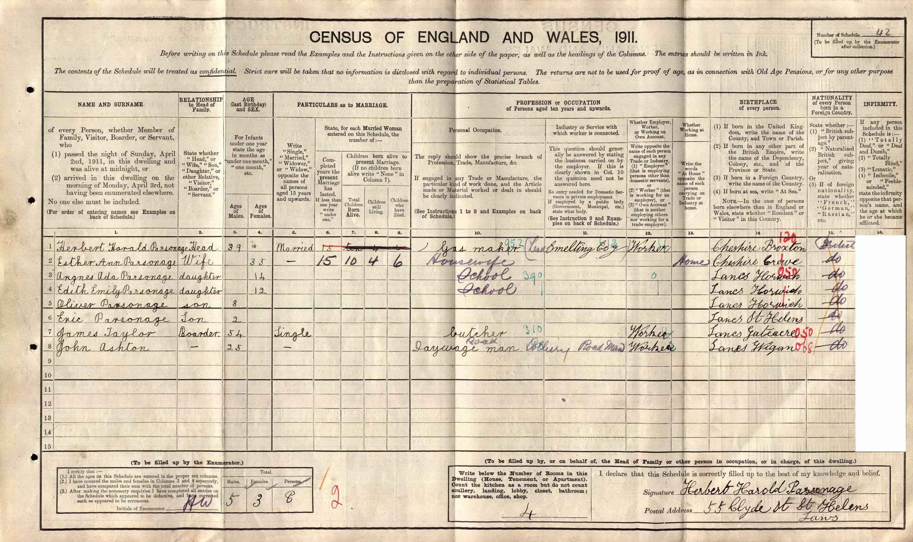 Esther Ann Morris also went by the name of Tet this was her father's pet name for her. Her married name was Parsonage. She was born on 1 November 1875 at 56 Alton Street, Monks Coppenhall, Cheshire. She appeared on the 1881 Census in 26 Alton Street, Monks Coppenhall, Crewe, Cheshire, and Oliver Morris, Emily White, Ada Mary Morris, Agnes Morris, Arthur Morris, Oliver Morris, Clement Morris and William Henry Morris were living in the same household; The head of household, Oliver was described as a forgeman (iron), and Emily was described as a British Subject born East Indies. Esther Ann Morris appeared on the 1891 Census in 192 Chorley New Road, Horwich, Bolton, Lancashire, and Oliver Morris, Emily White, Arthur Morris, Oliver Morris, Clement Morris and William Henry Morris were living in the same household; The head of household, Oliver was described as a forge foreman. Arthur, Oliver and Clement were also described as forgemen. Also lodging in the household was another forgeman, Joseph Webb aged 16 years. Esther Ann Morris married Herbert Harold Parsonage, son of Thomas Parsonage and Frances Elizabeth Blake, on 14 March 1896 at Holy Trinity, Hulme, Manchester, Lancashire, and the ceremony was witnessed by William Buxton Rogers and Fanny Gill; the marriage certificate shows Herbert and Esther were both living at 64 Dale Street, Hulme at the time and that Herbert was a forgeman. Esther Ann Morris appeared on the 1901 Census in 3 Armstrong Street, Horwich, Bolton, Lancashire, and Herbert Harold Parsonage, Agnes Ada Parsonage and Edith Emily Parsonage were living in the same household; Herbert was described as a Gasmaker at Railway Engine Works. There were two lodgers also living with the family. Esther Ann Parsonage appeared on the 1911 Census in, St Helens, Lancashire, , and Herbert Harold Parsonage, Agnes Ada Parsonage, Edith Emily Parsonage, Oliver Parsonage and Eric Parsonage were living in the same household; Herbert was described as a Gas Maker at the Lead Smelting Company, and there were two lodgers James Taylor and John Ashton. The census record shows that there were 10 children that had been born alive and just four of them living at the time. There were 8 persons in the house sharing four rooms which included any kitchen. Barbara Jager's father (Ben Smith) once remarked that Esther made the best curry he had tasted. He also told her of an occasion when he had a headache and Esther brought out a shoe box full of different pills all mixed together and offered him one. Ben was horrified and said she should be careful not to poison herself. Esther said she new what each one was describing them, but nevertheless Ben didn't take up the offer. In her later years when her eyesight was failing, Esther would often ask her daughter Edith to give her one red one and one blue one, etc when she needed to take the pills.