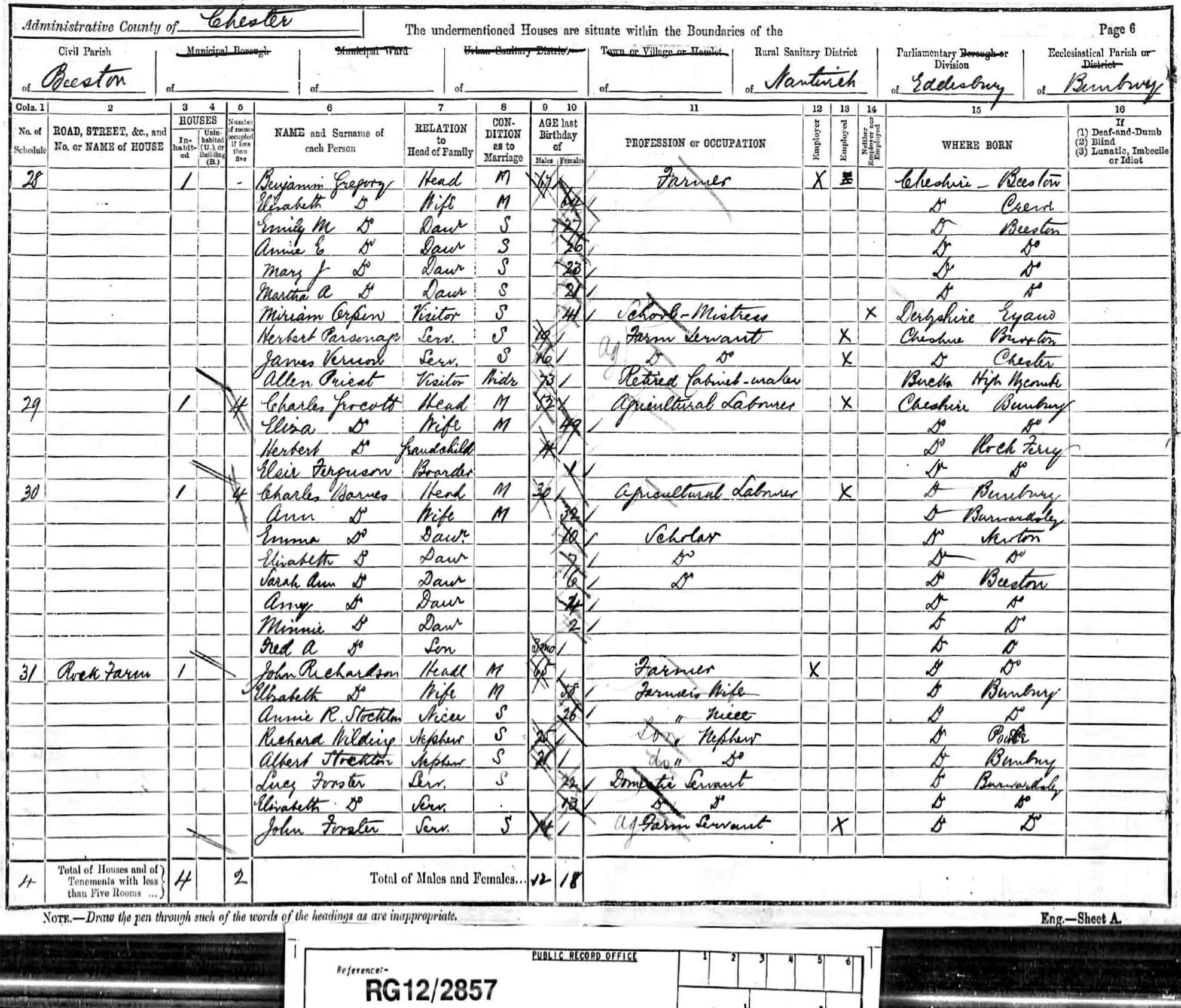 Mary Parsonage was born on 24 November 1799 at Gresford, Denbighshire. She married Timothy Parsonage, son of Timothy Parsonage and Phoebe Lloyd, on 12 May 1819 at, Gresford, Denbighshire, , and the ceremony was witnessed by Richard Cocks and Phoebe Parsonage; Timothy and Mary were cousins (their fathers were brothers). Timothy was described as of Wrexham, and Mary of this parish. It is not yet known how the witness Phoebe was related to Timothy and Mary. His mothers name was Phoebe but at the time of his marriage she was dead so the witness Phoebe could be a sister, although there is as yet no trace of her baptism. The family lived at Trevalyn Farm, Trevalyn, Denbighshire. Mary ran the farm after her husbands death in 1839 until at least 1871. In the Tithe records of 1842 she is shown as farmer of 139 acres (rented) and 5 acres owned.The farm is now known as Trevalyn Farm and on the Tithe map it is marked as Parsonage's Farm. Trevalyn Farm is still in existence (1992) and is still being actively farmed, although no longer by a Parsonage. The farm house is very old and dates to perhaps the 1400's. There is a date on an over-mantle which is 1558 with the initials AM & BM. These were the Meredith family who built that part of the house onto the older part. The farm was later owned by DR Daniel Williams who appears to have left it to trustees in his will of 1711. It is from the Trust of Dr Williams that Mary Parsonage rented the farm. Mary Parsonage appeared on the 1851 Census in Trevalyn Farm, Allington, Denbighshire, and Mary Parsonage, Timothy Parsonage, Eliza Parsonage, John Parsonage, Catherine Parsonage, Adelaide Parsonage and Frederick Parsonage were living in the same household; Mary, a widow, the head of household, described herself as farmer of 198 acres employing 4 labourers. Elizabeth was a milliner and John a draper. Also in the household was a servant, Martha Mercer aged 14 years. Mary Parsonage appeared on the 1861 Census in Trevalyn Farm, Allington, Denbighshire, and Mary Parsonage, Timothy Parsonage, Adelaide Parsonage, Frederick Parsonage and Kate Gibson were living in the same household; The head of the household, Mary, describes herself as a farmer of 200 acres employing two labourers. Her daughter Mary was described as a dairy maid, Adelaide and Frederick as helpers, and Timothy as a farmer. Also in the household at that time was a 1 year old visitor named Kate Parsonage Gibson, described as grandaughter to Mary. Mary Parsonage appeared on the 1871 Census in Trevalyn Farm, Allington, Denbighshire, and Timothy Parsonage, Adelaide Parsonage and Frederick Parsonage were living in the same household; The head of the household, Mary, at the age of 72 still described herself as a farmer. A lodger named William Stoddart was staying at the farm and he gave his occupation as a government surveyor. It is possible that he was involved in the drawing of Ordnance Survey maps which were in their infancy at that time. Mary Parsonage appeared on the 1881 Census in Darland, Allington, Denbighshire, and Timothy Parsonage, Henry Price and Eleanor Parsonage were living in the same household; Mary, the head of the household, described herself as a retired farmer. Timothy's occupation was described as farmer's son. There were two other people in the house at the time a Henry Price, son in law aged 60 born Wisconsin, America, and Ellen Price aged 56 daughter born Wisconsin, America. This was most likely Eleanor and the census enumerator may have recorded their current residence as their place of birth. Mary Parsonage died on 9 February 1884 at Darland, Allington, Denbighshire, at age 84; The death was registered on 12th March 1884 by Mary's daughter Mary Parsonage, of Darland. The cause of death was given as congestion of the liver 1 month 7 days, suppression of urine 4 days, exhaustion.