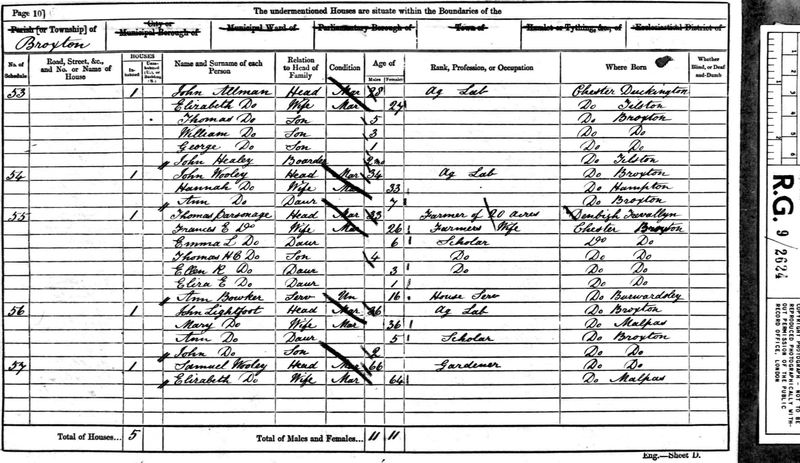 | Marriage* | She married Thomas Parsonage, son of Timothy Parsonage and Mary Parsonage, on 17 November 1853 at Malpas Parish Church, Malpas, Cheshire, and the ceremony was witnessed by Timothy Parsonage and Catherine Parsonage; On his marriage certificate Thomas gave his occupation as surgeon. This was probably an embellishment of the truth, as he had been an assistant to a surgeon just two years earlier on the census. |