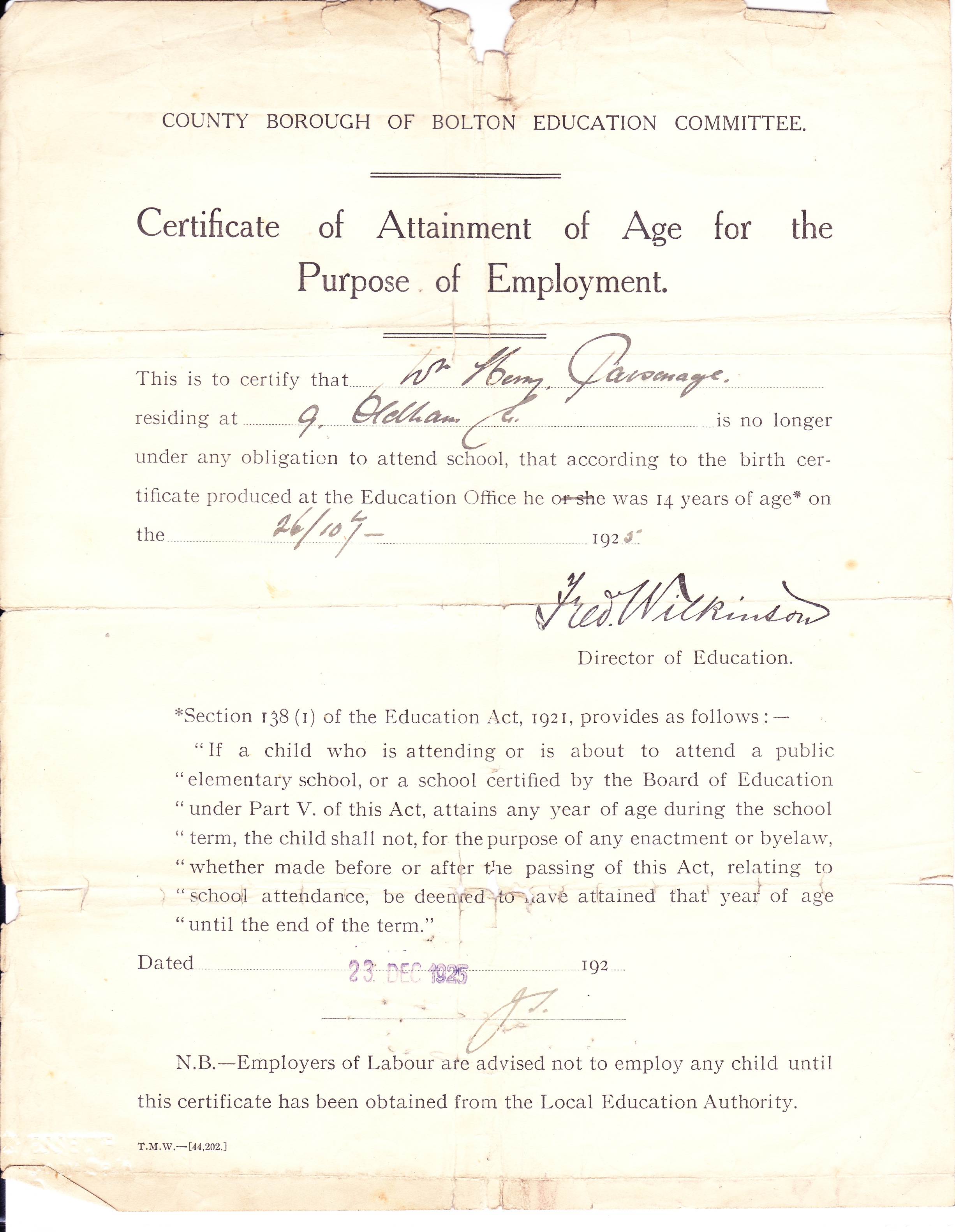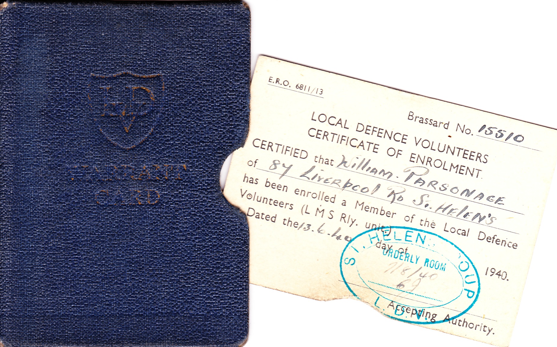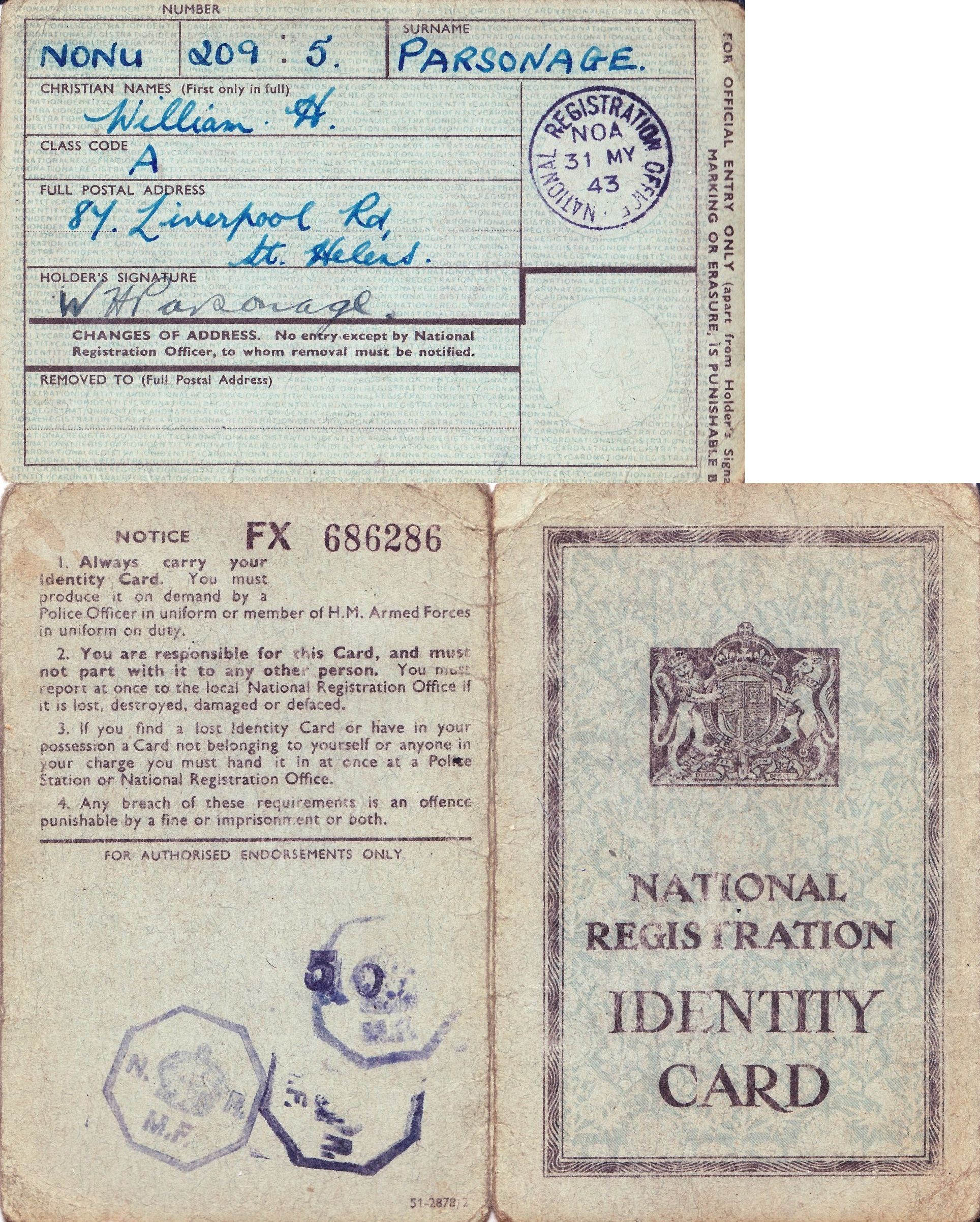 William Henry Parsonage was born on 26 October 1911 at 65 St Peters Street, St Helens, Lancashire. He was baptised at St Thomas, Westfield Street, St Helens, Lancashire. He lived on 26 October 1925 at 9 Oldham Street, Bolton, Lancashire; According to his wife Elsie he moved to Bolton with his family when he was five years old. Circa 1930 at, Bolton, Lancashire, , William Henry Parsonage worked in a mill. In 1936 William Henry Parsonage started work on the railway. He worked as a Porter at Rainford Junction, Prescot, and Shaw Street, St Helens. He became a goods guard and later a passenger guard. He was reputed to have a large appetite. When he was a lodger on Bickerstaffe Street he was served with Hotpot in a washing up bowl to see if he could eat it all and he could. In the canteen at Sutton Oak Sheds where he met his wife Elsie he was challenged to eat a large number of poached eggs and the canteen staff had to give up before he did for fear of running out of eggs to feed the other men. He began military service on 13 June 1940; He did not serve in the regular forces during the war as he was in a protected occupation so he served in the Home Guard. He ended military service on 31 December 1944. He married Elsie Chaulk, daughter of Henry Chaulk and Elizabeth Ann Hardman, on 23 February 1952 at Sutton Road Methodist Church, St Helens, Lancashire, and the ceremony was witnessed by Ellen Parkinson and Oliver Parsonage; At the time of the marriage William Henry was a Railway Goods Guard living at 87 Liverpool Road, St Helens and Elsie was a canteen assistant living at 6 Station Road, St Helens. In March 1972 at St Helens, Lancashire, William Henry Parsonage retired from the railway, taking early retirement. He was awarded a certificate of service and presented with chiming mantle clock for his 36 years service. He died on 13 May 1974 at Royal Infirmary, Liverpool, Lancashire, at age 62; Cause of death renal failure, myelosclerosis. He was cremated on 16 May 1974 at St Helens Crematorium, Lancashire.