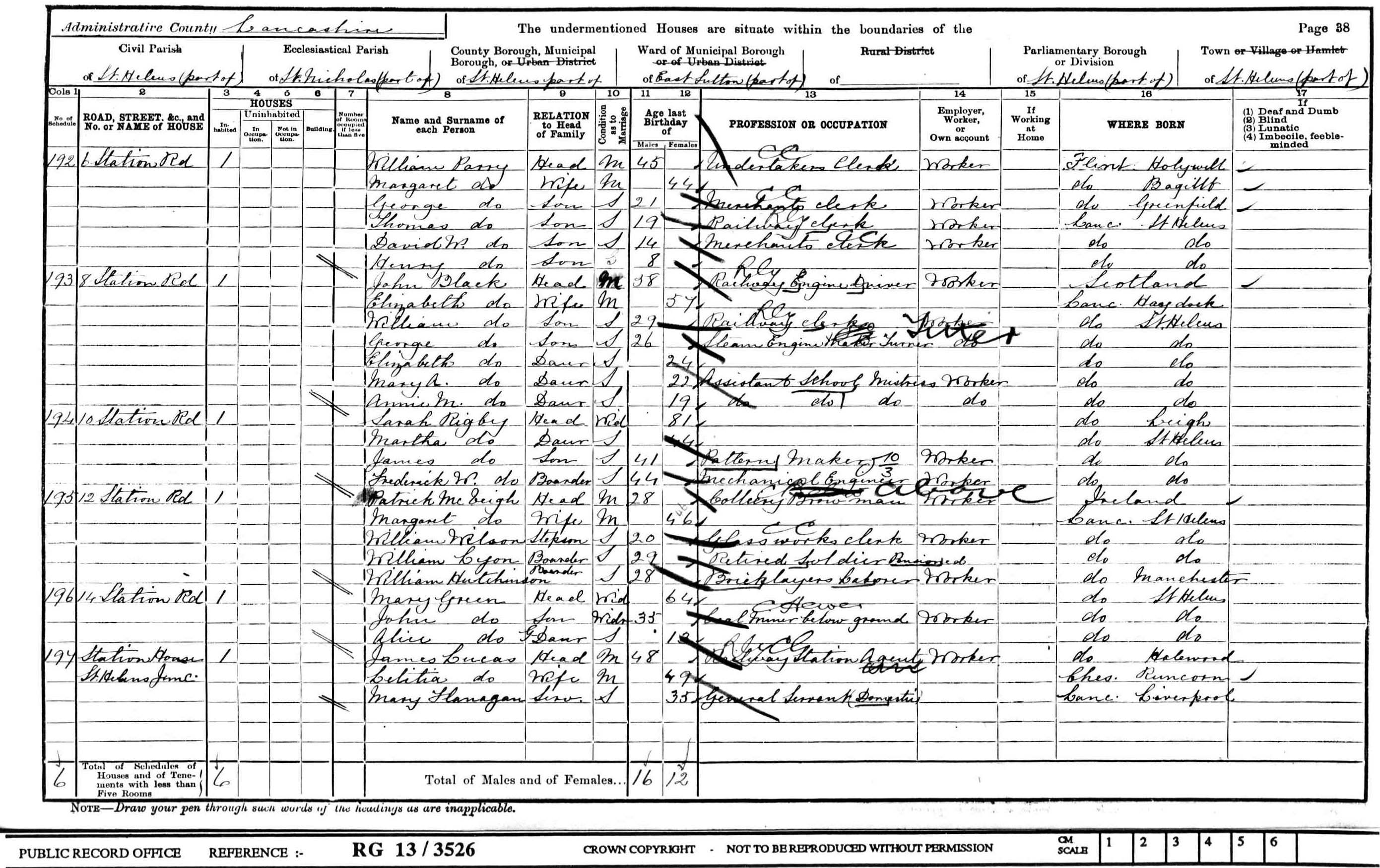 John Black was born circa 1843 at Fife, Scotland. He married Elizabeth Dearden. John Black appeared on the 1881 Census in 30 Fenneys Lane, Sutton, St Helens, Lancashire, and Elizabeth Dearden, William Black, Margaret Black, George Black and Mary Ann Black were living in the same household; John the head was a loco driver. It appears that Fenneys Lane was previously known as Mount Pleasant. John Black appeared on the 1891 Census in, St Helens, Lancashire, , and Elizabeth Dearden, William Black, Margaret Black, George Black, Mary Ann Black and Annie May Black were living in the same household; John the head was described as a railway engine driver, William a clerk, Margaret a dressmaker, George an apprentice fitter. John Black appeared on the 1901 Census in, St Helens, Lancashire, , and Elizabeth Dearden, George Black, Annie May Black, Elizabeth Black and Mary Ann Black were living in the same household; John the head was a railway engine driver, William was a railway clerk, George a steam engine maker turner, Mary and Annie were assistant school mistresses.