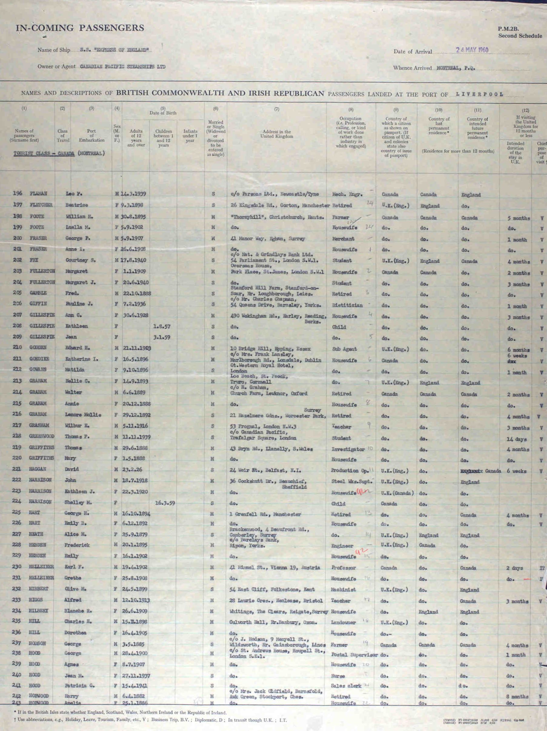 Her married name was Hart. Emily Blanche Chaulk was born on 6 December 1892 at St Helens, Lancashire. She appeared on the 1901 Census in 24 Church Street, St Helens, Lancashire, and Thomas Chaulk, Elizabeth Catherine Williams, William Henry Chaulk, Mary Elizabeth Chaulk, Jane Ellen Chaulk, Christopher Chaulk, Annie Chaulk, Maggie Chaulk, Charles Harold Anderson Chaulk and Thomas Chaulk were living in the same household; Thomas was described as a platelayer (railway), William a boilermaker and Mary a waggon sheet ringer. Emily Blanche Chaulk married George Henry Hart. Emily Blanche Hart witnessed the immigration of George Henry Hart on 24 May 1960 at, ; George and Emily arrived in Liverpool coming from Montreal. They were headed for 1 Grenfell Road, Manchester which may have been the address of his brother, and gave the length of stay as 4 months. George was retired and Emily a houswife. Emily Blanche Chaulk died in 1979 at Canada. She was buried in 1979 at Canada.