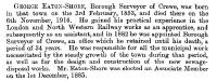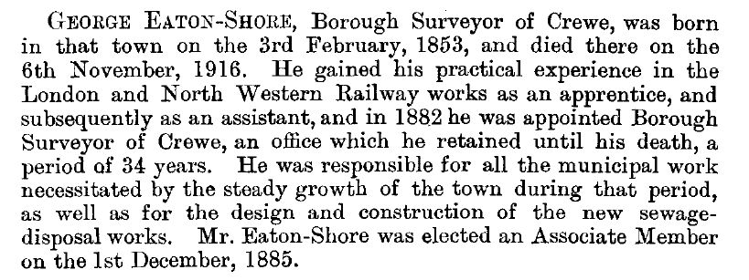 George Eaton Shore was born in 1853. He married Emma Louisa Parsonage, daughter of Thomas Parsonage and Frances Elizabeth Blake, in 1882 at, Cheshire, . George Eaton Shore appeared on the 1891 Census in, Crewe, Cheshire, , and Elizabeth Mary Louisa Eaton Shore, John James Eaton Shore, William Eaton Shore, Richard Eaton Shore, Emma Louisa Parsonage and Mary Elizabeth Parsonage were living in the same household; George was the Borough Surveyor and Mary Parsonage his sister in law was a visitor. George Eaton Shore appeared on the 1911 Census in, Crewe, Cheshire, , and Elizabeth Mary Louisa Eaton Shore, John James Eaton Shore and Emma Louisa Parsonage were living in the same household; George was the Borough Surveyor of Crewe and his son John was the Assistant Surveyor. Elizabeth Reeves a servant lived with teh family.