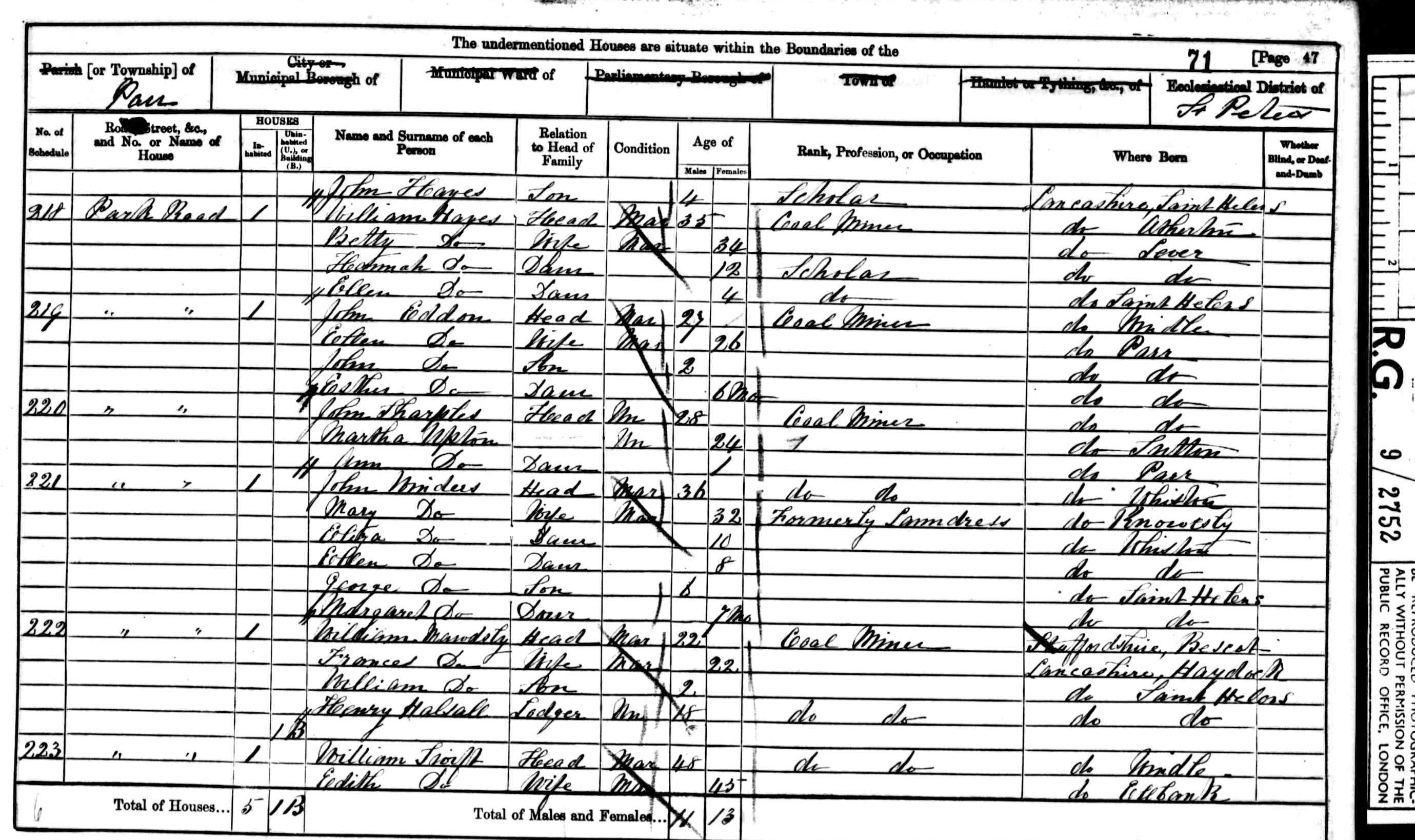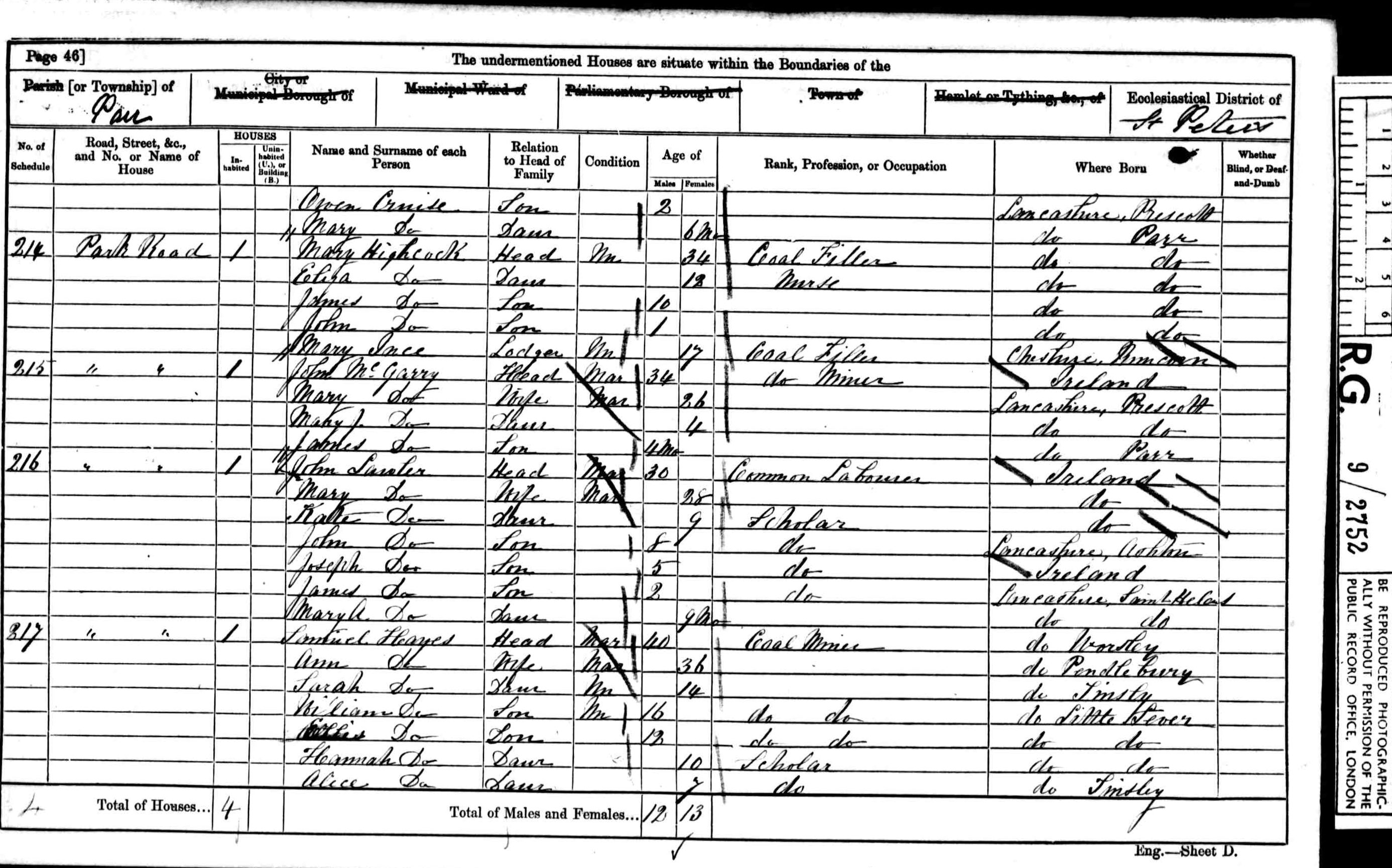 James Hardman was born circa 1855. He appeared on the 1861 Census in, Prescot, Lancashire, , and Elizabeth Hardman, John Hardman, Margaret Sixsmith, Thomas Hardman, Ellen Hardman and Daniel Hardman were living in the same household; John, the head, was a carter. Elizabeth was a char woman. Also staying at the house was Mary Sixsmith sister in law who was described as an invalid. James Hardman appeared on the 1871 Census in, St Helens, Lancashire, , and John Hardman, Thomas Hardman, Ellen Hardman, Samuel Hayes, John Hayes, Ashton Hayes, Mary Hayes, Samuel Hayes and Elizabeth Hardman were living in the same household; Samuel Hayes the head was a collier. Thomas, James and Ellen were recorded as step children. John Hardman was a labourer and recorded as a boarder.