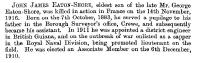 John James Eaton Shore was born circa 1884. He appeared on the 1891 Census in, Crewe, Cheshire, , and George Eaton Shore, Elizabeth Mary Louisa Eaton Shore, William Eaton Shore, Richard Eaton Shore, Emma Louisa Parsonage and Mary Elizabeth Parsonage were living in the same household; George was the Borough Surveyor and Mary Parsonage his sister in law was a visitor. John James Eaton Shore appeared on the 1911 Census in, Crewe, Cheshire, , and George Eaton Shore, Elizabeth Mary Louisa Eaton Shore and Emma Louisa Parsonage were living in the same household; George was the Borough Surveyor of Crewe and his son John was the Assistant Surveyor. Elizabeth Reeves a servant lived with teh family.